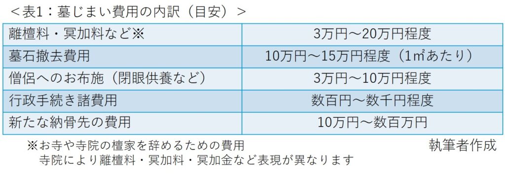 墓じまいにかかる平均費用は、20〜50万円程度といわれています。これは現在のお墓を閉じる費用で、さらに新しい納骨先の費用を加えると全体で50~200万円、もしくは300万円程度になるといわれており、新たな納骨先の選択によって費用は大きく変わってきます。墓じまいの一般的な費用の内訳(目安)を下表に示します。