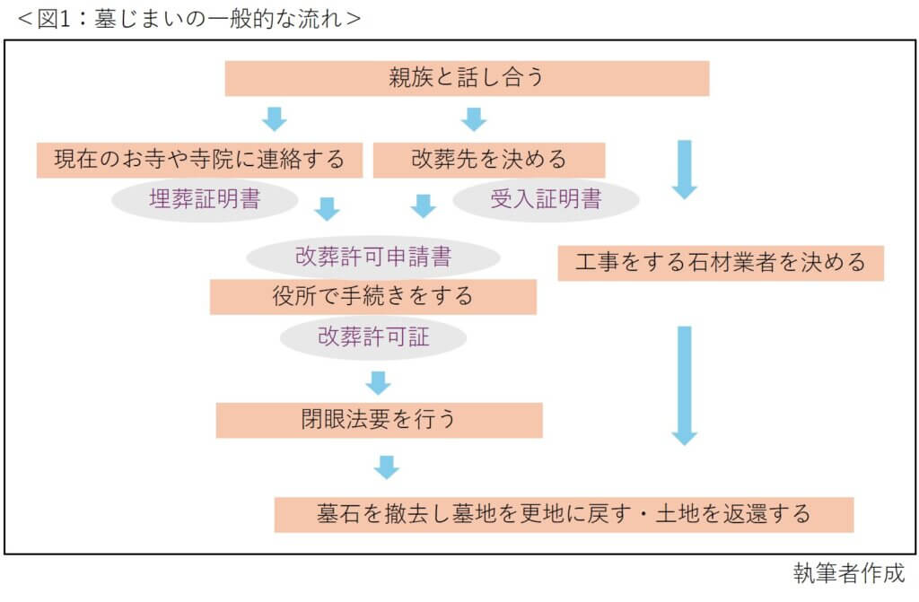 自分の家のお墓だからといって、勝手に遺骨を取り出したり、墓石を撤去したりはできません。墓じまいには、お墓を管理している寺院・霊園の許可や、自治体の手続きなどが必要です。墓じまいの一般的な流れは下図のようになります。