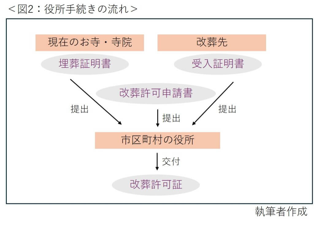 現在のお墓がある市区町村の自治体に「改葬許可申請書(※)」と、お墓の管理者から発行された「埋葬証明書」、改葬先の管理者から発行された「受入証明書」を提出し、「改葬許可証」を交付してもらいます。(<図2>参照)
