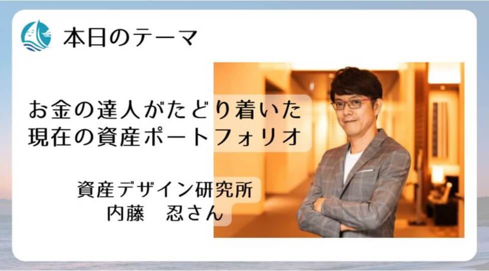 本日のゲストは、資産デザイン研究所の内藤忍さん。『お金の達人がたどり着いた現在の資産ポートフォリオ』をテーマに約60分、内藤さんとさや子ママ、大介マスターのやりとりに耳を傾けました。