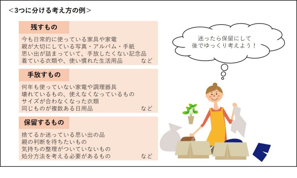 判断に迷ったら、無理に決断する必要はなく「保留するもの」にします。保留という選択肢があることで、気持ちの負担を軽くしながら片づけを進めることができます。保留したものは、時間をおいて改めて検討すれば良いですし、保留という形で手元に残しておけば、後で親がゆっくりと考えて判断する時間が作れます。